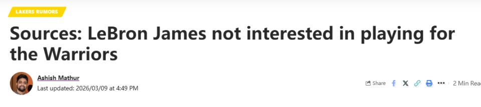 3月10日,Lakers Daily报道称:如果勒布朗·詹姆斯今年夏季不退役,他下赛季无意加入金州勇士队。