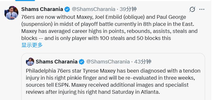 北京时间3月11日,据知名记者Shams报道,费城76人队的明星后卫马克西被诊断为右手小指肌腱损伤,将在三周后接受复查。