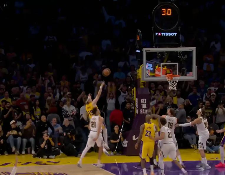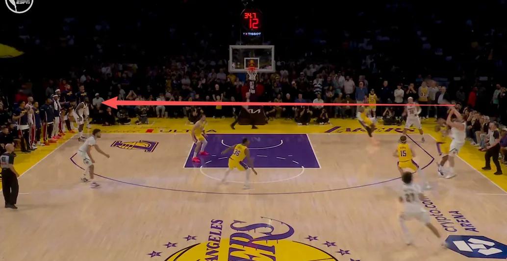 下一回合,约基奇再次展现其恐怖的球场视野。湖人几乎将所有防守资源集中在约基奇身上,将他逼至右侧边线位置。但约基奇一记超大对角线传球,找到底角的哈达威,后者命中三分再度反超。