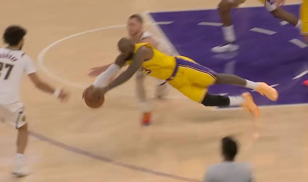 进入最后一分钟,比赛最动人的一幕出现。掘金投篮不中,一个长篮板飞向底线,詹姆斯精准预判落点,但脚步速度已不足以抢先拿到球,于是他毫不犹豫飞身鱼跃扑出,在布劳恩身前抢到篮球。