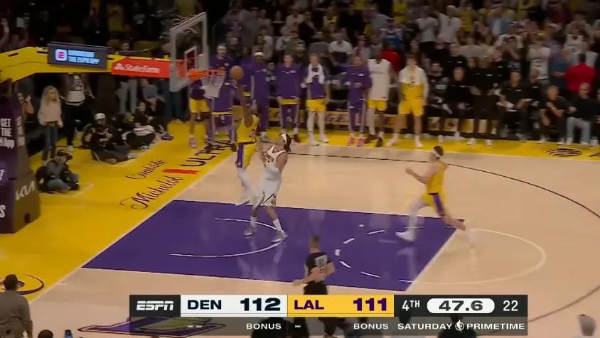 约基奇上篮得分再度追平比分,湖人最后一攻交给东契奇。东契奇起初准备走中路,看到布朗上前夹击后立即转向底角,使掘金包夹失效。随后面对琼斯的单防,在底线位置撤步中投,绝杀命中,为这场比赛画上最完美的句号。