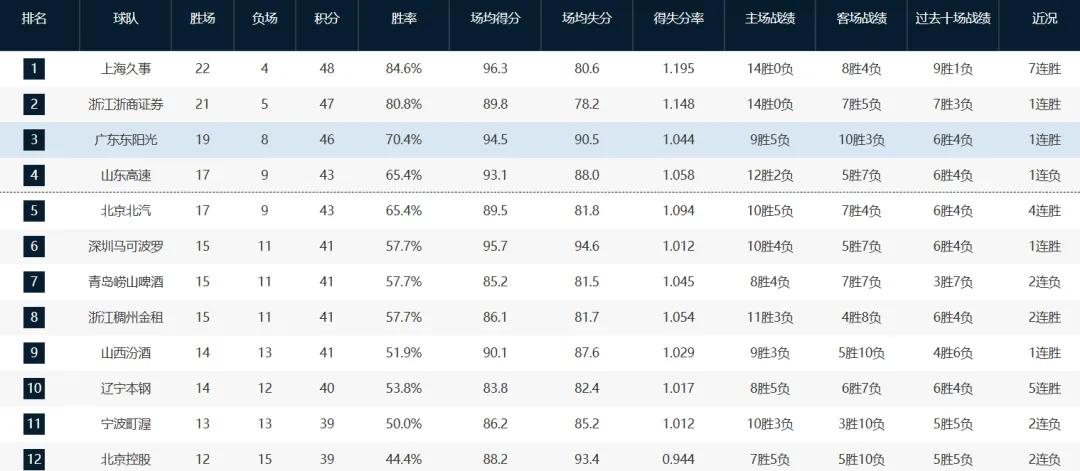 本场比赛后,广东队以19胜8负的战绩继续位居联盟第三,仅次于上海队(22胜4负)和卫冕冠军广厦队(21胜5负)。