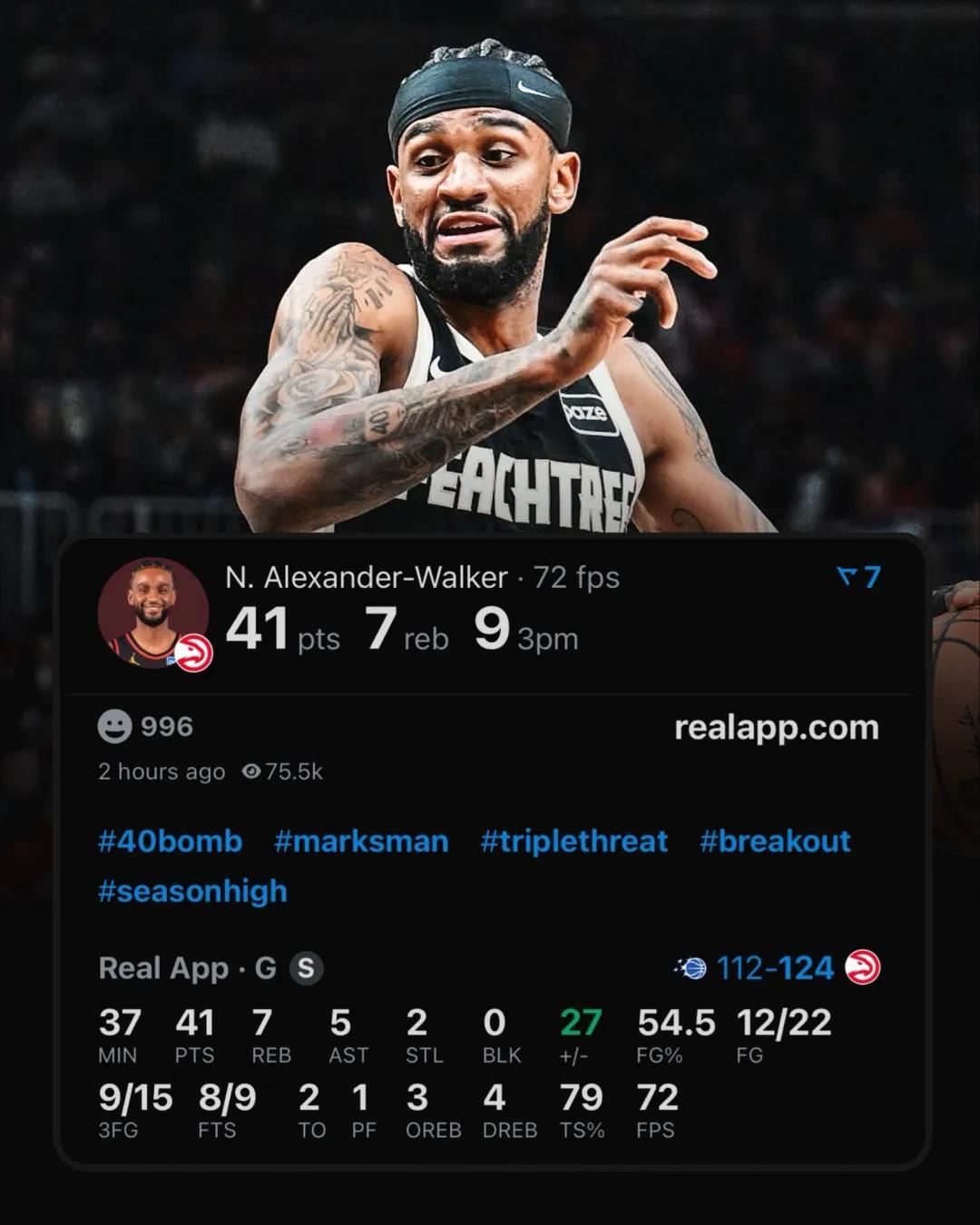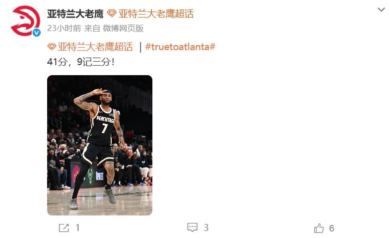 老鹰队中有一名球员进步速度惊人,即雷霆球星亚历山大的堂弟亚历山大-沃克,他最近对阵魔术的比赛21投12中,三分14中9狂砍生涯新高41分,另有7篮板5助攻2抢断,正负值达+27。