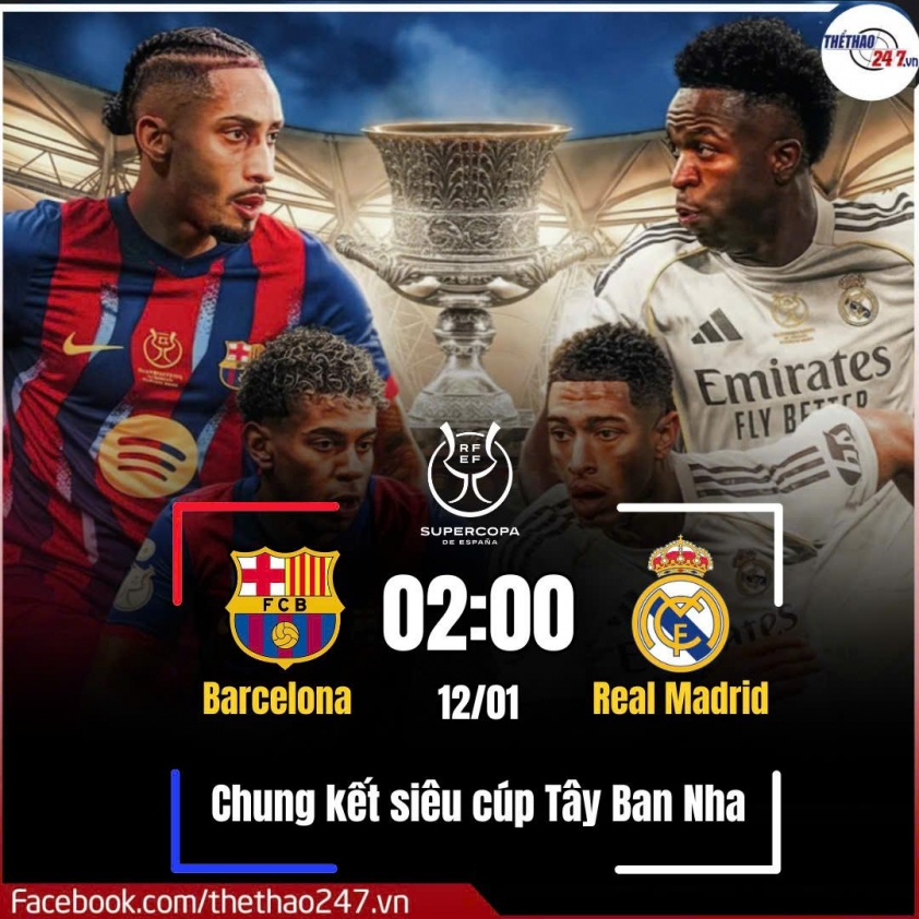 2026年西班牙超级杯决赛将于1月11日凌晨2点(越南时间)举行。巴塞罗那在半决赛中以5-1大胜毕尔巴鄂竞技晋级决赛,而皇家马德里则在1月9日凌晨以2-1击败马德里竞技。此次再度交锋,皇马决心扭转两队上一场决赛的结果。