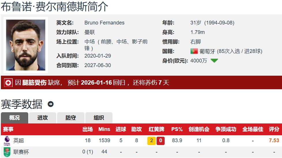 B费今年31岁,身高1.79米,惯用右脚,司职前腰,合同至2027年,德转估值为4000万欧元。本赛季他在英超出场18次,全部首发,其中14场踢满全场,共计1538分钟,攻入5球,助攻8次。