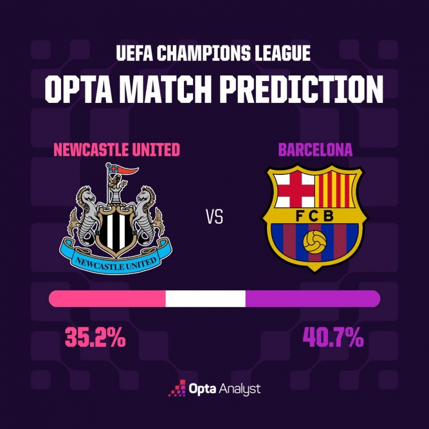 Opta超级计算机认为巴萨在欧冠16强首回合前稍优于纽卡斯尔,不过双方差距有限,预示着在圣詹姆斯公园球场的对决将十分激烈。
