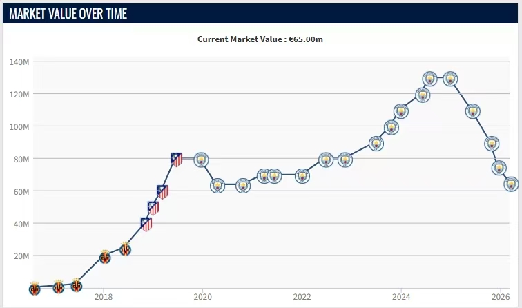 巅峰与低谷同时到来,2024年罗德里遭遇十字韧带重伤,自2024年9月起至今,一年半时间内这位金球奖中场缺席了343天,即使康复后状态大幅下滑,在曼城比赛中多次险些失误,近期表现才略有回升。但这一年半里,罗德里身价连续四次下跌,从巅峰期的1.3亿欧元跌至目前6500万欧元,正好减少了一半。