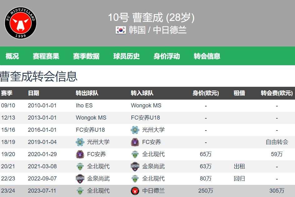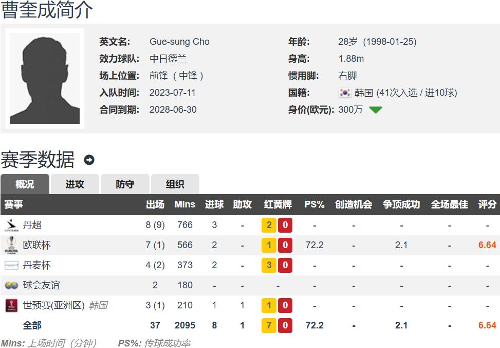 曹圭成现年28岁,身高1.88米,是一名右脚中锋,德国转会市场网站估价为300万欧元。战胜伤病后,本赛季他在各项赛事中为中日德兰出场32次,打入7球,并凭借出色表现重返韩国国家队,有望出战2026年美加墨世界杯。