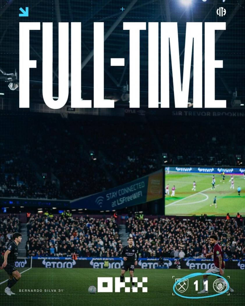 (足球赛果) - 对阵西汉姆联的这场灾难性平局,使得曼城与榜首阿森纳的积分差距已达9分。