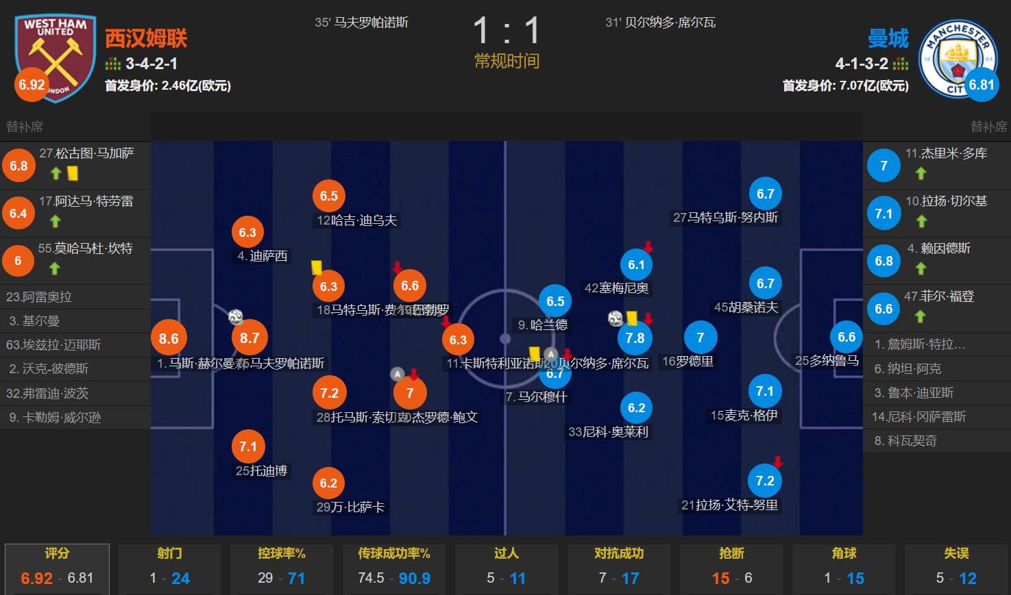 最终,西汉姆联1-1战平曼城,各取一分;西汉姆联凭借此战暂时逃离降级区,而曼城已落后榜首阿森纳9分,争冠希望提前渺茫。