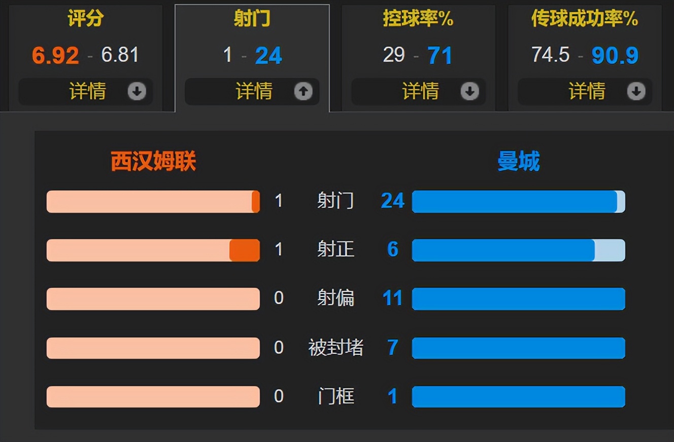 整场赛事,西汉姆联控球率仅29%,全场仅一次射门且射正一次;曼城疯狂射门24次,其中6次射正。如此占据优势却未能取胜的比赛,责任在于瓜迪奥拉;哈兰德这种缺乏背身能力和头球技术的中锋,与任何搭档都无法兼容,上场搭档是塞梅尼奥,本场是马尔穆什,或许无锋阵更适合曼城,至少能增加跑动和穿插。若瓜迪奥拉坚持使用哈兰德,则应专注于反击战术,“魔人”与传控及破解密集防守的战术并不相容。