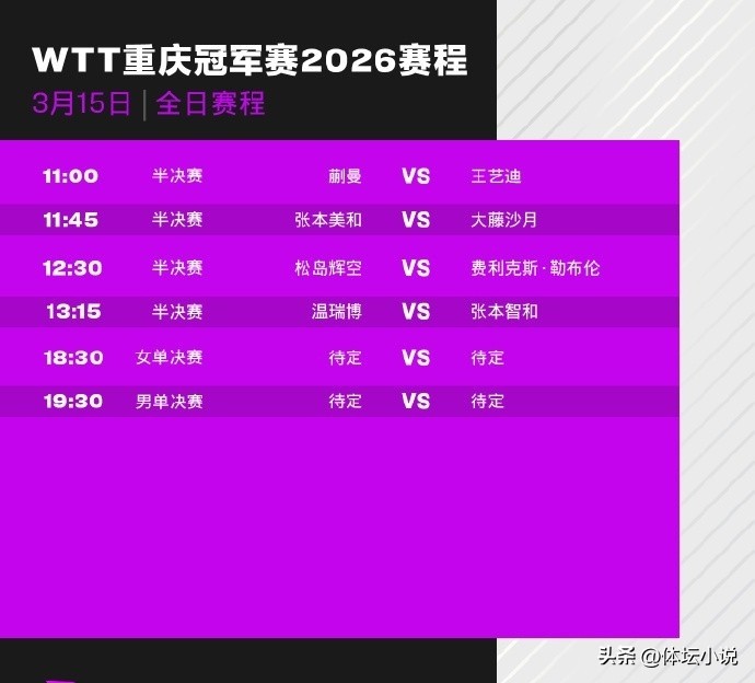 北京时间3月15日,WTT重庆冠军赛进入收官日,男女单打半决赛和决赛将依次上演,最终冠军即将揭晓。国乒在四分之一决赛中多人落败,夺冠压力陡增,男女单冠军均遭遇不小挑战。眼下四场半决赛正同步进行,女单蒯曼已以4比1击败王艺迪,率先晋级决赛,为国乒冲击冠军;而男单仅存温瑞博一位选手,他即将出战,能否突破半决赛尚不确定!