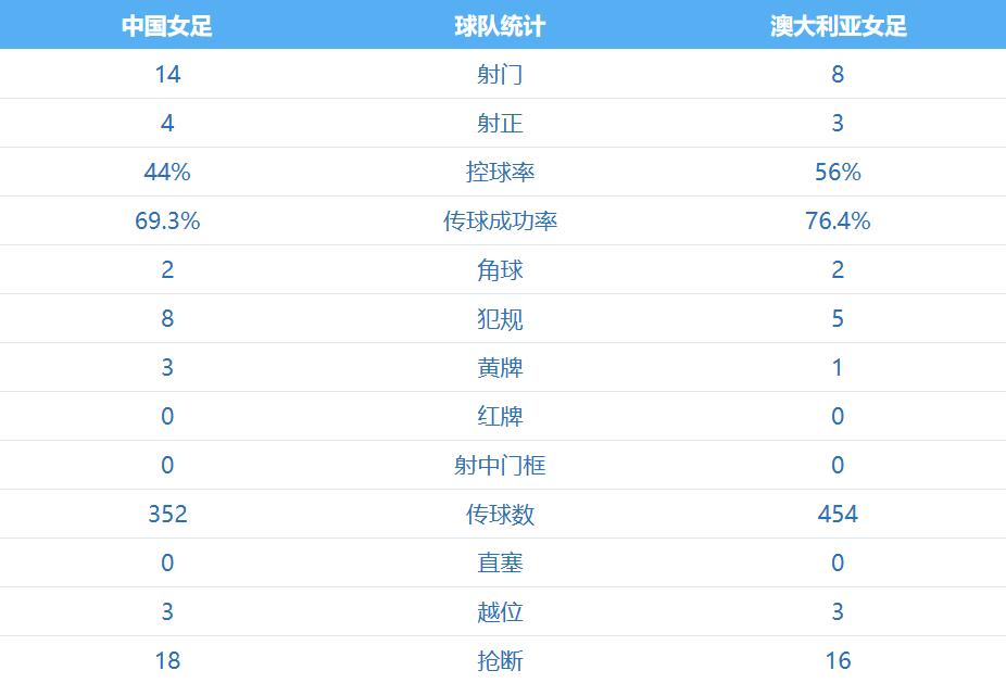整场赛事,中国女足控球率为44%,共有14次射门,比澳大利亚女足多6次,其中4次射正,也比对手多1次。