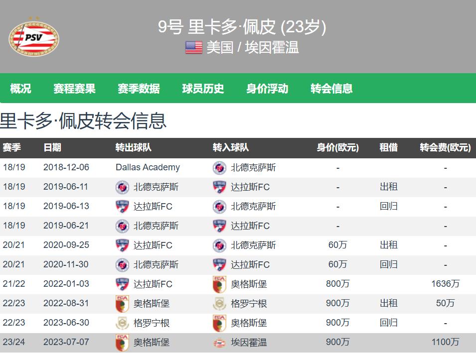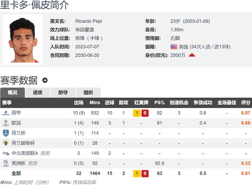 佩皮现年23岁,身高1.85米,右脚球员,德转估值2500万欧元,与埃因霍温的合同至2030年,是美国国家队成员,代表美国队出场34次,打入13球。本赛季至今,佩皮为埃因霍温出场27次,贡献13球2助,其中荷甲19场10次首发10球1助,欧冠5场1次首发3球1助。