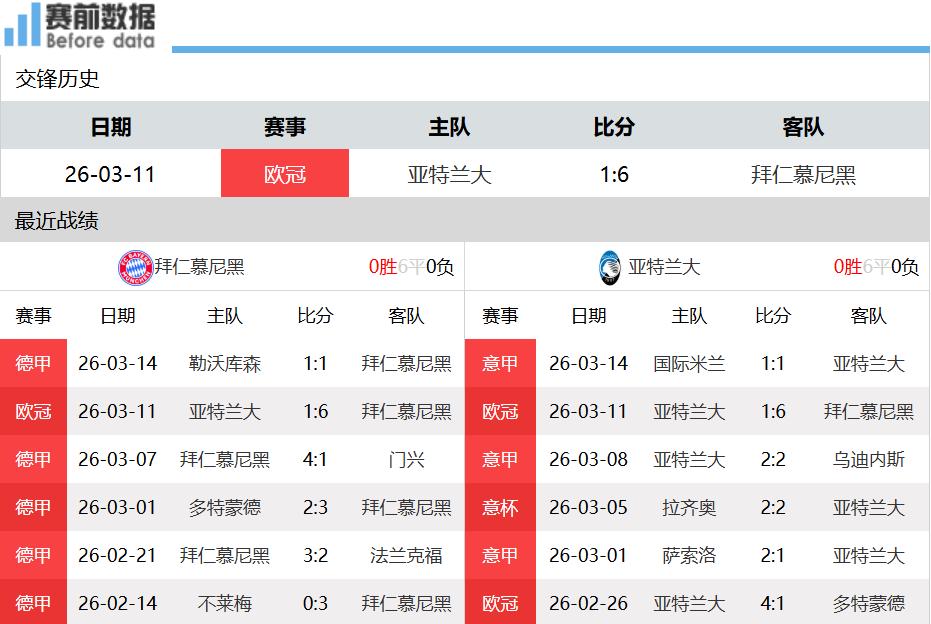 第一点:两队现状!拜仁是德甲领头羊,全队总身价9.6亿欧元;亚特兰大目前位列意甲第七,全队总身价3.86亿欧元。上一场比赛,九人拜仁客场1-1与勒沃库森战平,各项赛事七连胜被终结;亚特兰大客场1-1与国际米兰战平,各项赛事五场未能取胜。