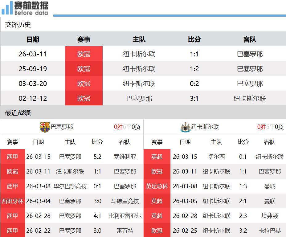 北京时间3月19日凌晨01:45,欧冠1/8决赛次回合,巴萨主场对阵纽卡斯尔,首回合纽卡斯尔主场与巴萨1-1战平。