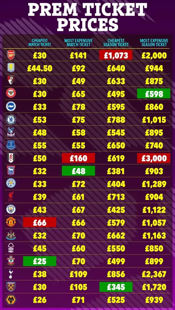 影响票价波动的因素众多,包括俱乐部地理位置、上赛季成绩、历史地位、对手强弱等。平均收入较高的伦敦地区票价普遍较高,其他地区相对较低。但曼彻斯特和利物浦因俱乐部历史成绩优异,票价更贵。传统豪门近年票价上涨,主要源于票务供不应求。俱乐部当前表现也会推动票价上涨,上赛季及本赛季阿斯顿维拉、纽卡斯尔联因进入欧战,票价相应上调3%至5%。对手不同票价亦有差异,以阿森纳主场上层中心区零售票价为例,区间在68-168欧元(约570-1400元)之间。较低价位适用于对阵弱旅,较高价位适用于对阵争冠对手曼城或同城死敌热刺。